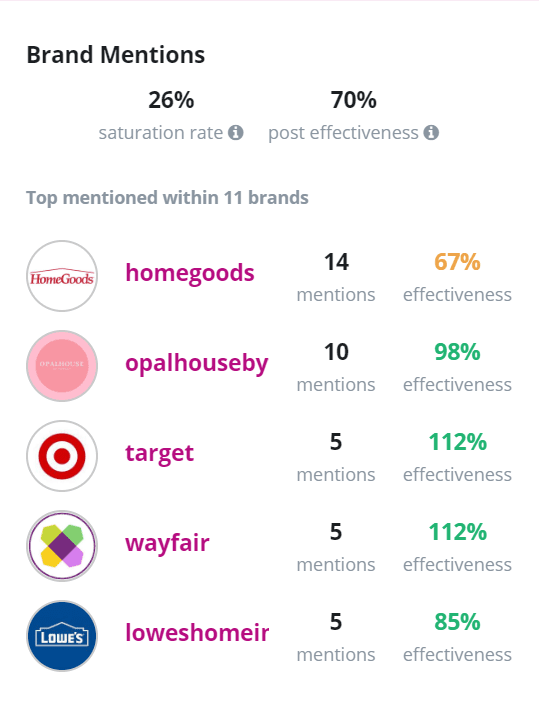 You can identify sponsored content frequency by simply looking through an influencer’s feed. Not a fan of manual work? Upfluence also has a brand mention data collection that shows you how often an influencer mentions brands, which brands they mention, how many times they mention that brand, and how well those branded posts perform compared to their average engagement rate.