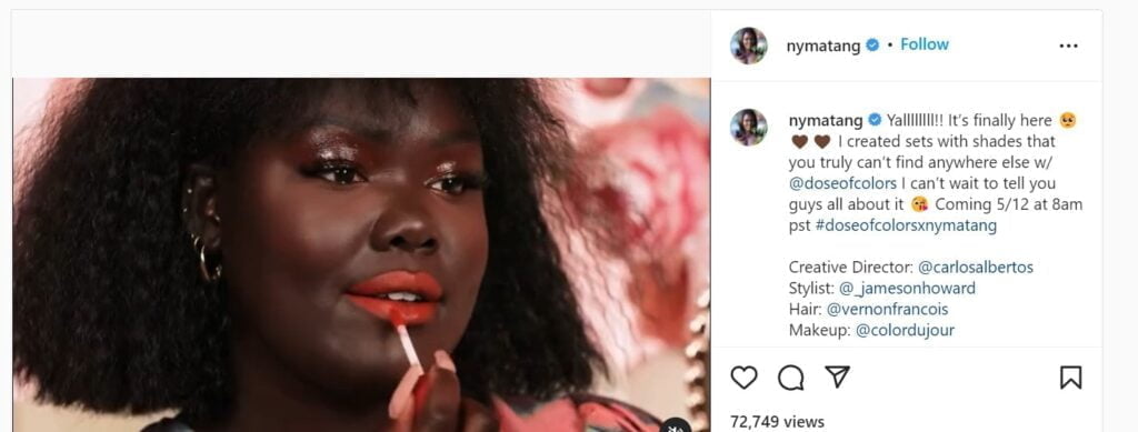 In the example above, Nyma Tang, a well-known beauty macro-influencer has teamed with beauty brand, Dose of Colors to bring unique shades of lipstick and lip gloss to the market. By working with an influencer to create truly unique and sought-after products, Dose of Colors is in the perfect position to reach a new customer base and drive more conversions.Â